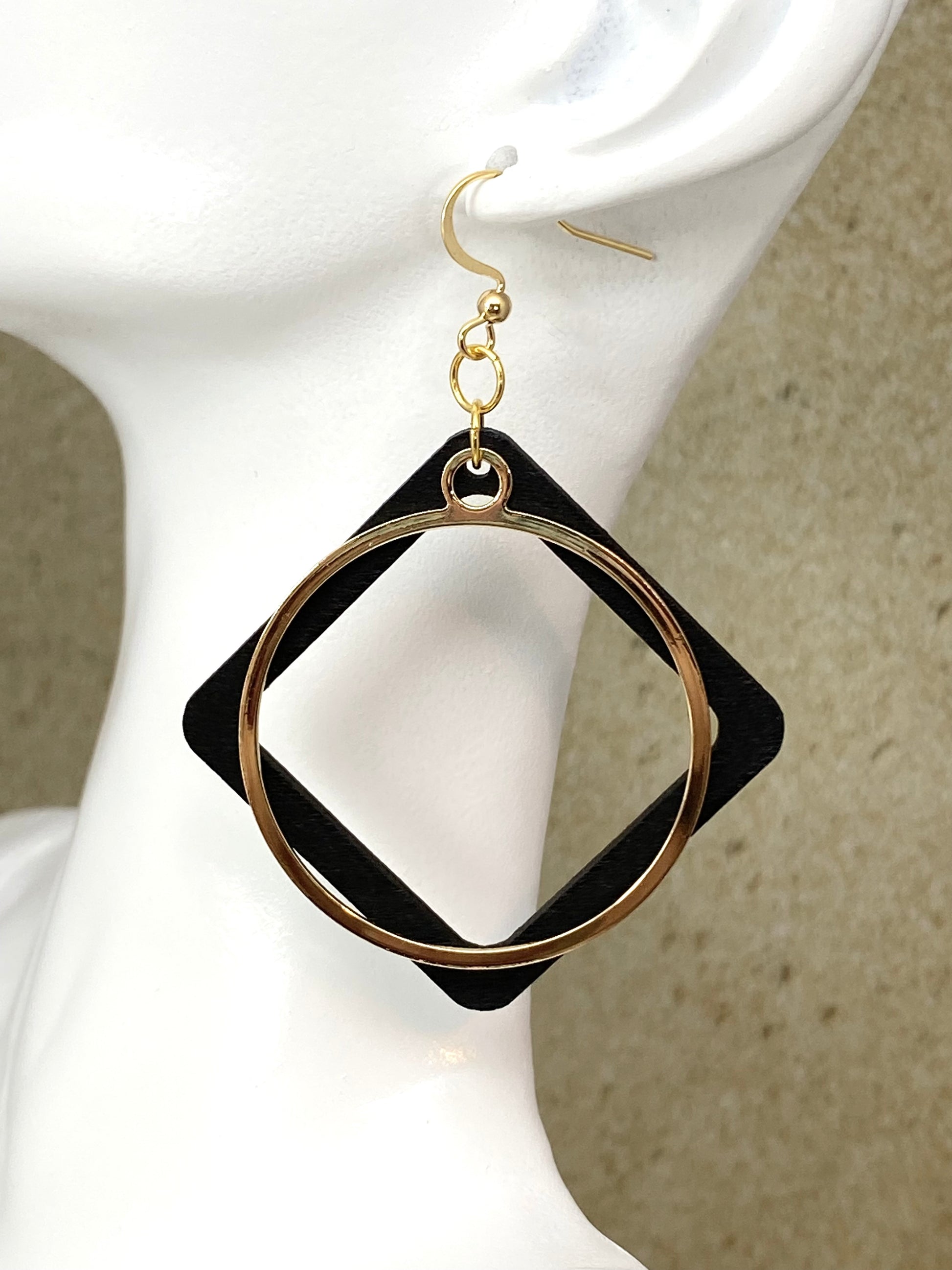These earrings are perfect for those looking for a subtle yet unique accessory. The geometric diamond shapes are made from wood, and hand painted black, creating a lightweight feel. The gold colored circle connectors add a touch of elegance. These two geometric shapes together are a stylish addition to any outfit. The dangle length is 2.5 inches.