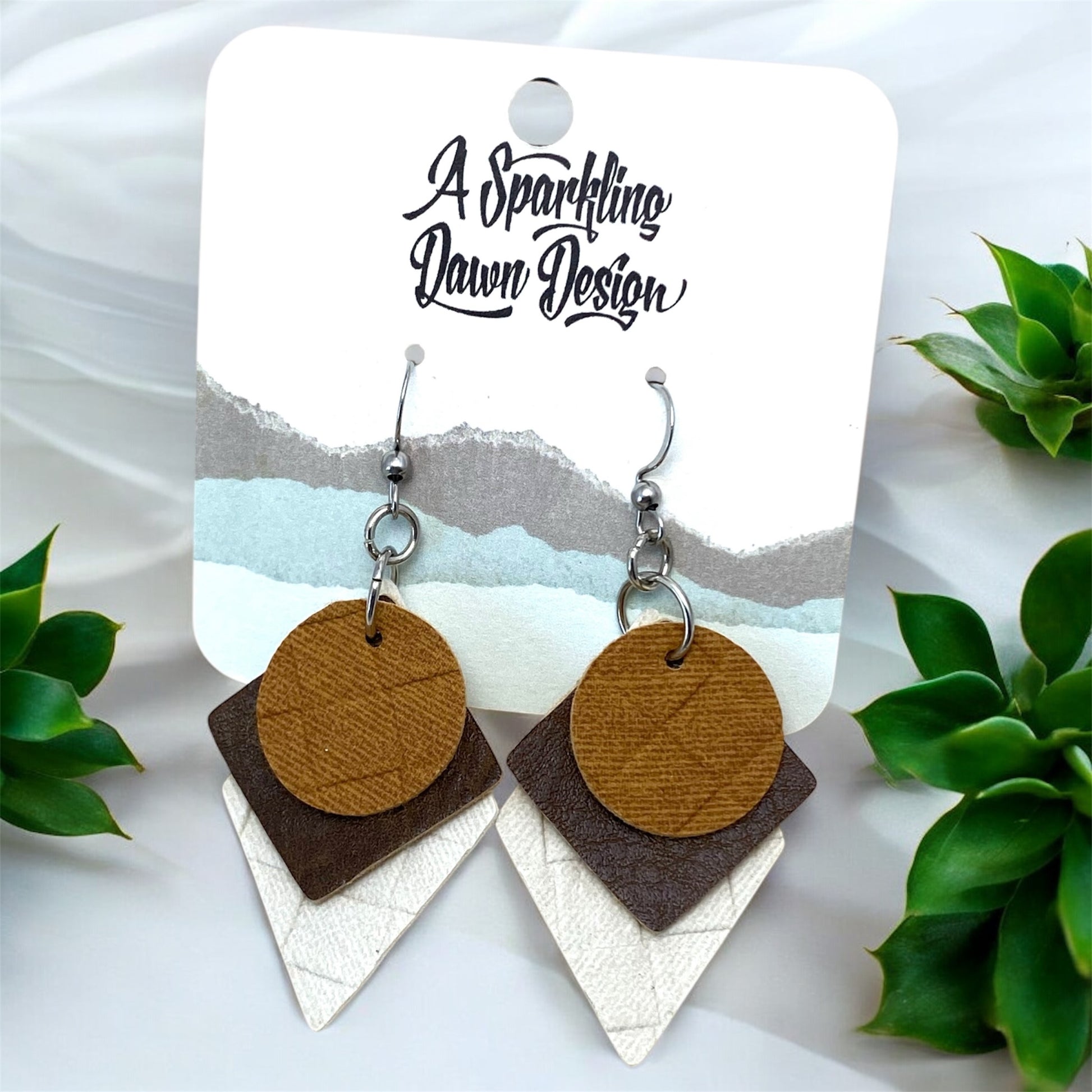 These geometric faux leather earrings are not only stylish, but also lightweight, making them comfortable to wear all day. The 3 colors are tan, brown, and cream white. Crafted with a geometric design, they are a unique addition to any outfit.