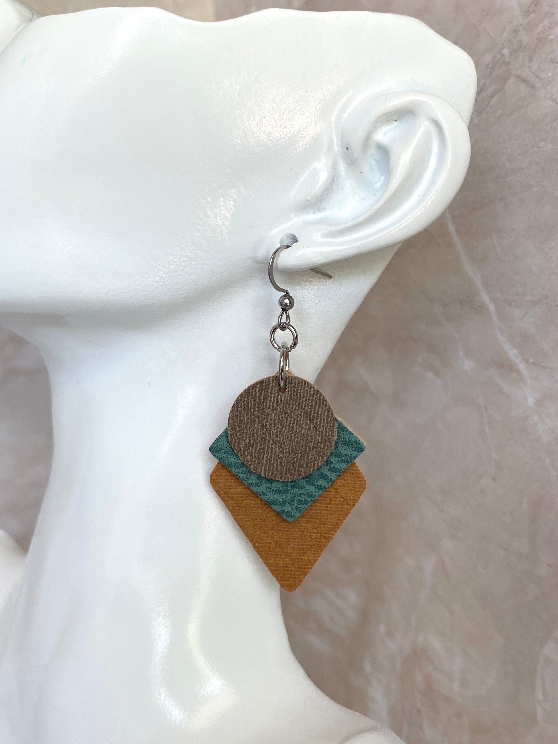 These geometric faux leather earrings are not only stylish, but also lightweight, making them comfortable to wear all day. The 3 colors are mauve, teal, and tan. Crafted with a geometric design, they are a unique addition to any outfit.