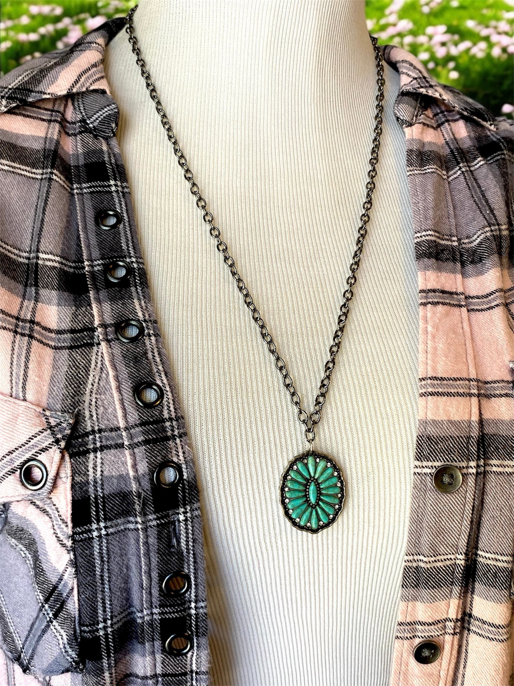This stunning 25 inch necklace features a 1 inch antique silver and turquoise pendant on a sleek black cable chain. The simple and lightweight design makes it perfect for everyday wear, adding a touch of elegance to any outfit.