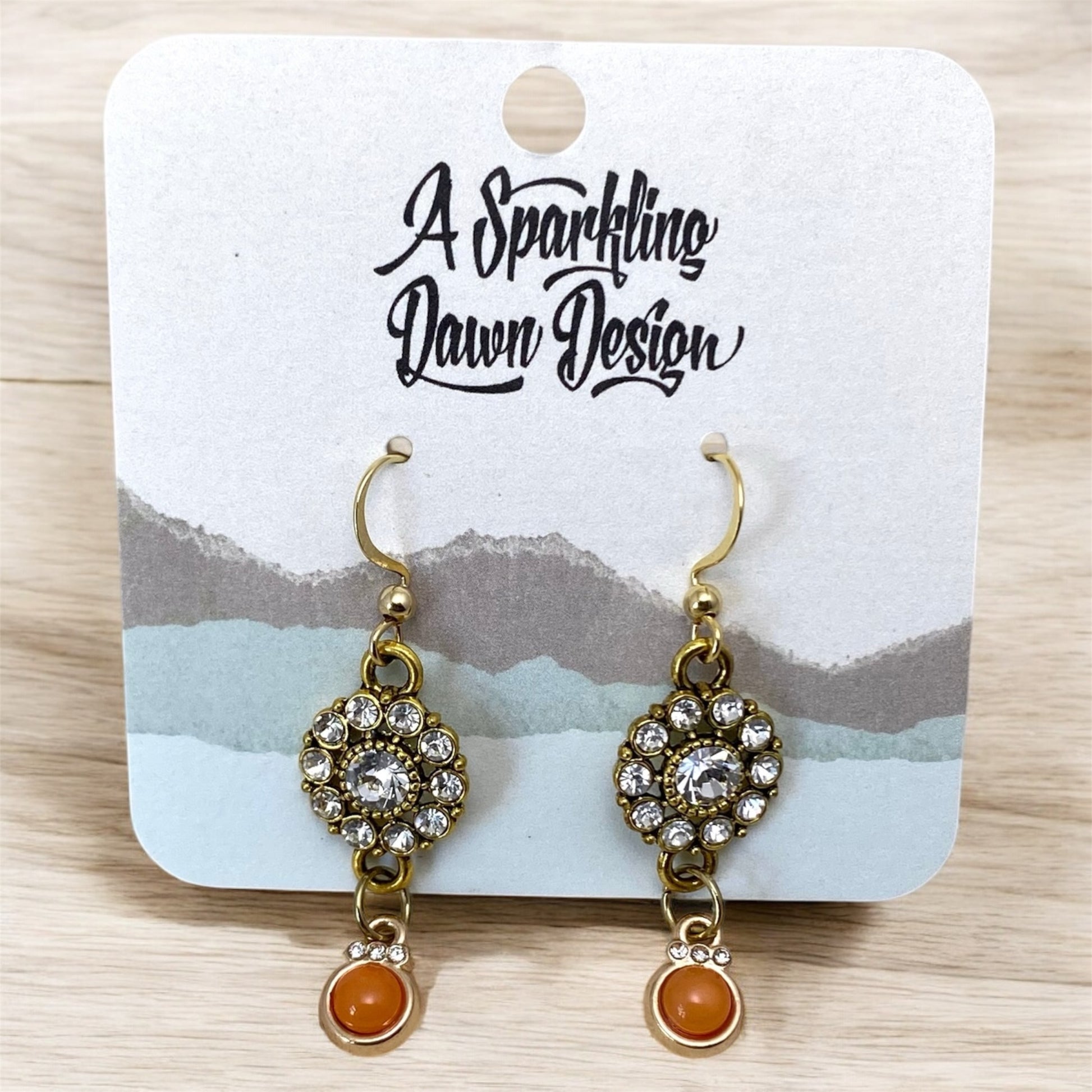 Add a touch of color to your outfit with our tangerine orange earrings. These elegant and lightweight earrings feature a bold orange charm and a sparkling rhinestone connector, adding a hint of glamour to any look. Perfect for a night out or to elevate your everyday style.