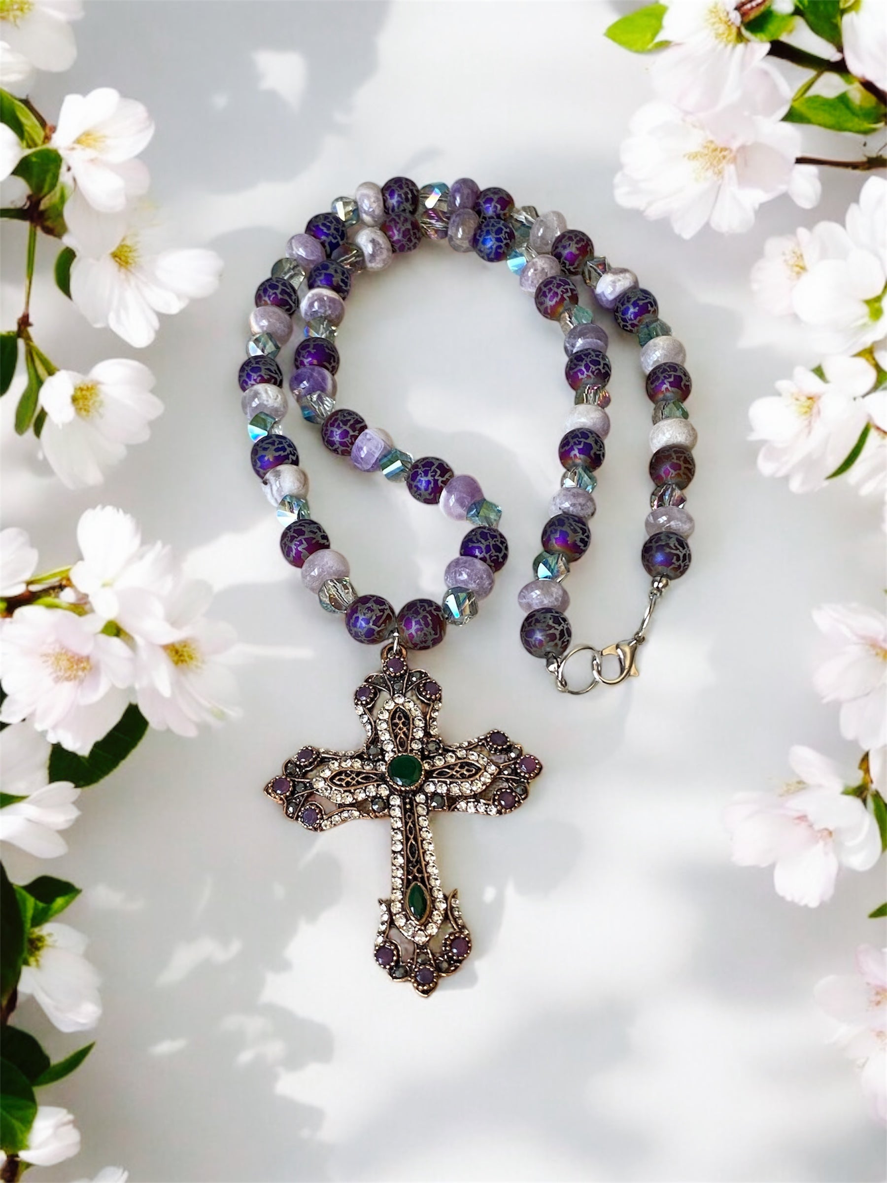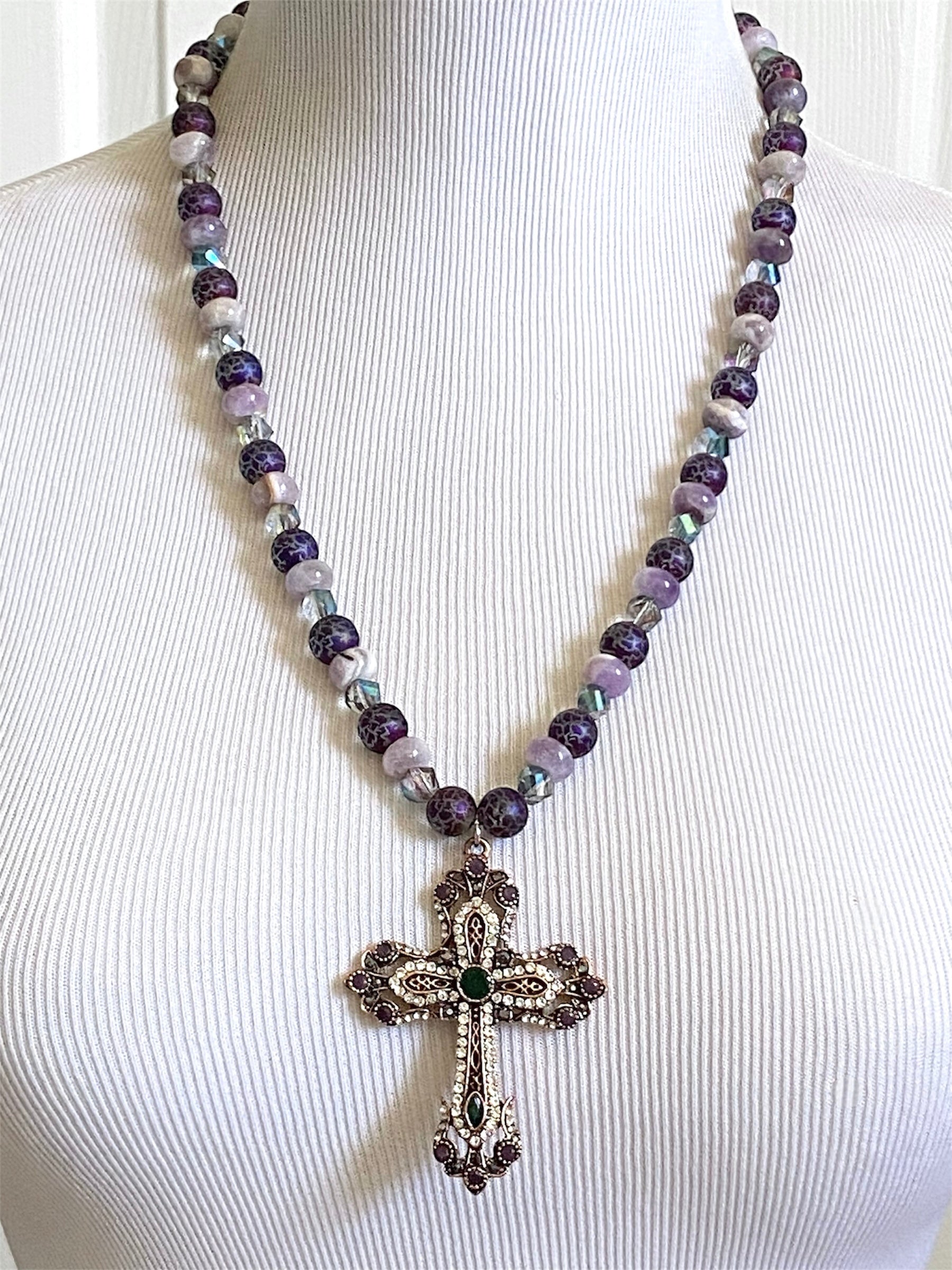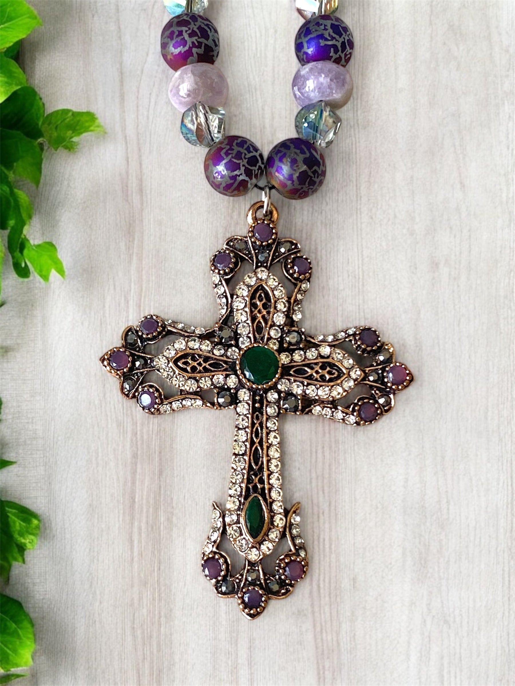 This 24 inch necklace is a stunning addition to any jewelry collection. Featuring a variety of glass and gemstone beads, along with a 2.75 inch rhinestone cross pendant, this necklace exudes elegance and sparkle. Perfect for any occasion, this necklace is a must-have for every fashion-forward individual.