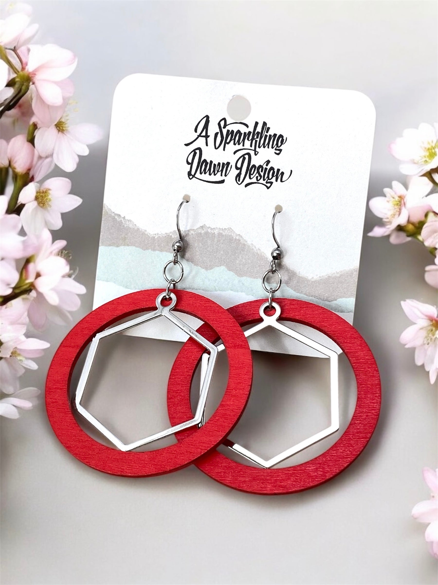 Add a pop of color to your outfit with these fashion forward earrings. These lightweight earrings feature red painted wood circles with silver octagon connectors, adding a touch of geometric style. Perfect for a modern and trendy look that won't weigh you down. The dangle length is 2.25 inches.