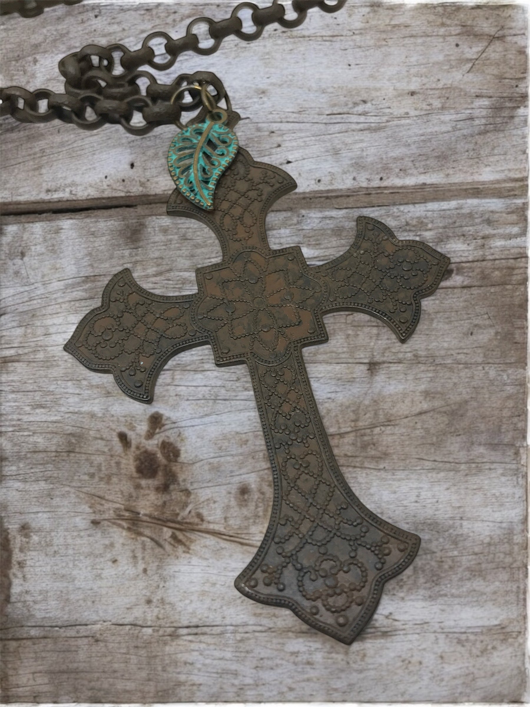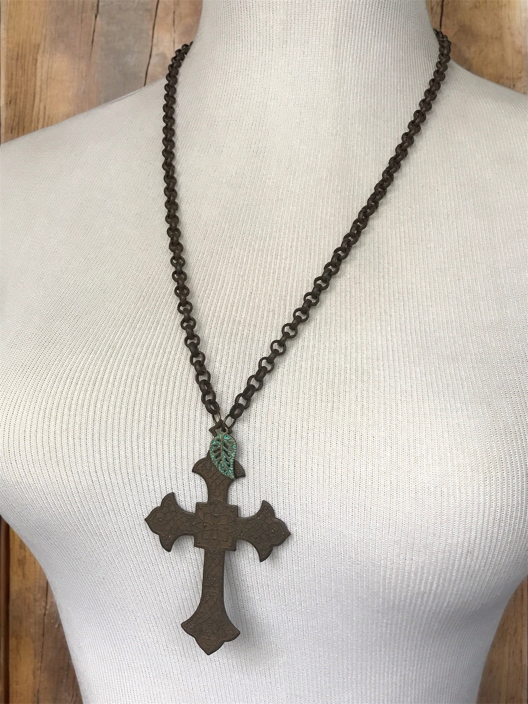 This beautiful 25 inch rustic necklace features a patina leaf charm and a rustic cross pendant. Its rustic brown rolo chain completes this gorgeous accessory for any look.