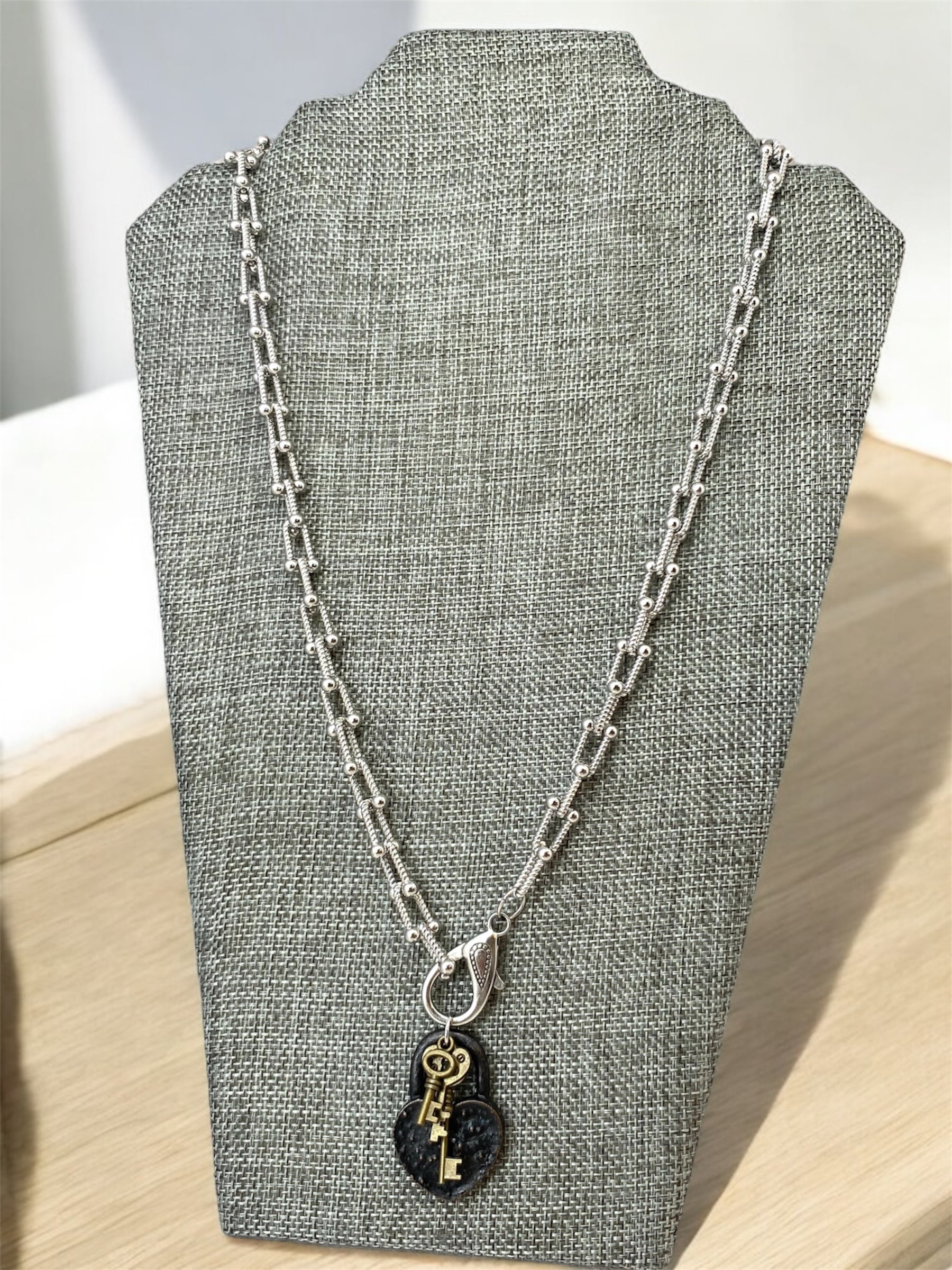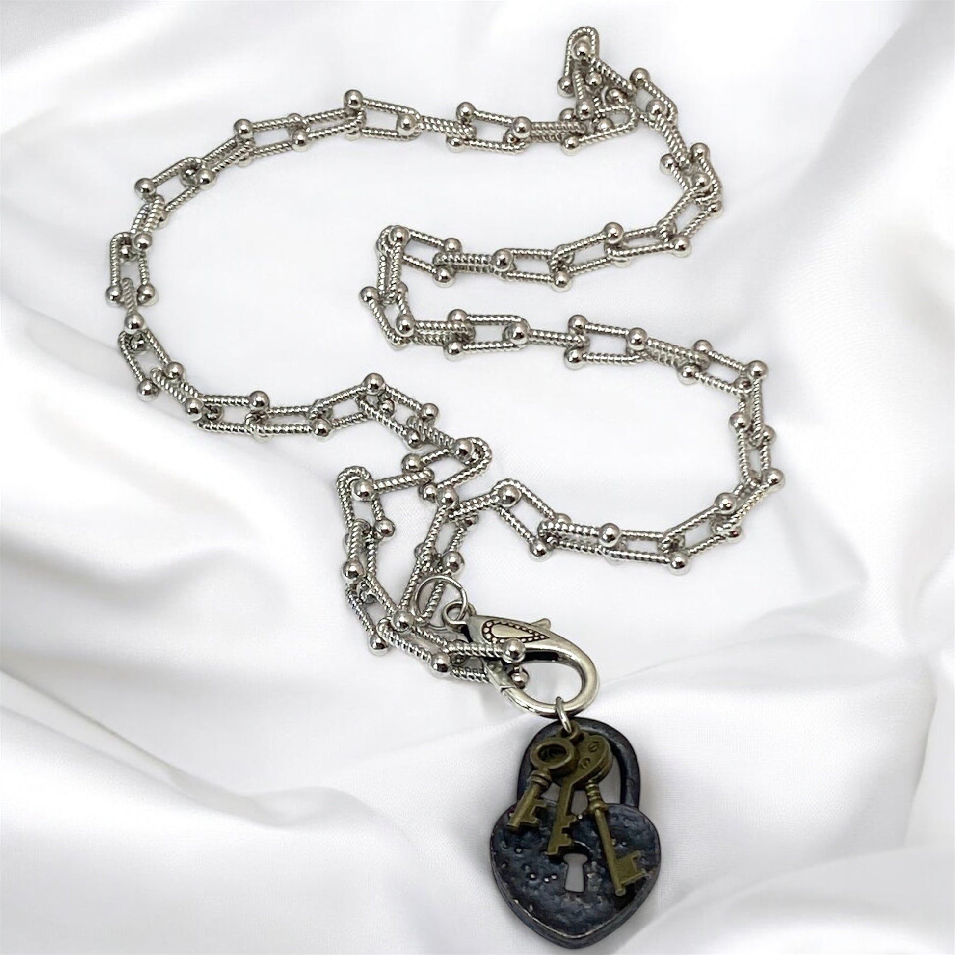 This lock and key necklace is perfect for boho style lovers. It features a rustic lock pendant dangling from a 24 inch u-link style chain and an oversized clasp that hooks in the front, giving it a unique look. With this stunning accessory, you'll make a statement that's both stylish and playful.